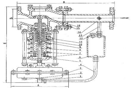 自力式調(diào)節(jié)閥是主要控制閥后壓力大小的一款閥門,閥門的作為方式為壓閉型。原理如下:介質(zhì)按照箭頭的方向流過閥體,并在閥芯、閥座受到節(jié)流后輸出。此外過蒸汽是由冷凝器冷卻溫度之后。壓力被引入執(zhí)行器并作用在在隔膜上,使得閥芯相應(yīng)地移位,從而達(dá)到降低壓力的目的。閥后設(shè)定壓力增加后,作用在隔膜上的力增加,壓縮彈簧,驅(qū)動(dòng)閥芯,減小閥門開度直到閥門壓力下降到設(shè)定值。類似地,如果閥后面的壓力減小,則作用在膜片上的力減小,并且彈簧的作用力強(qiáng)制彈起,驅(qū)動(dòng)閥芯,使閥門開度增大,直到閥門壓力上升到設(shè)定值。